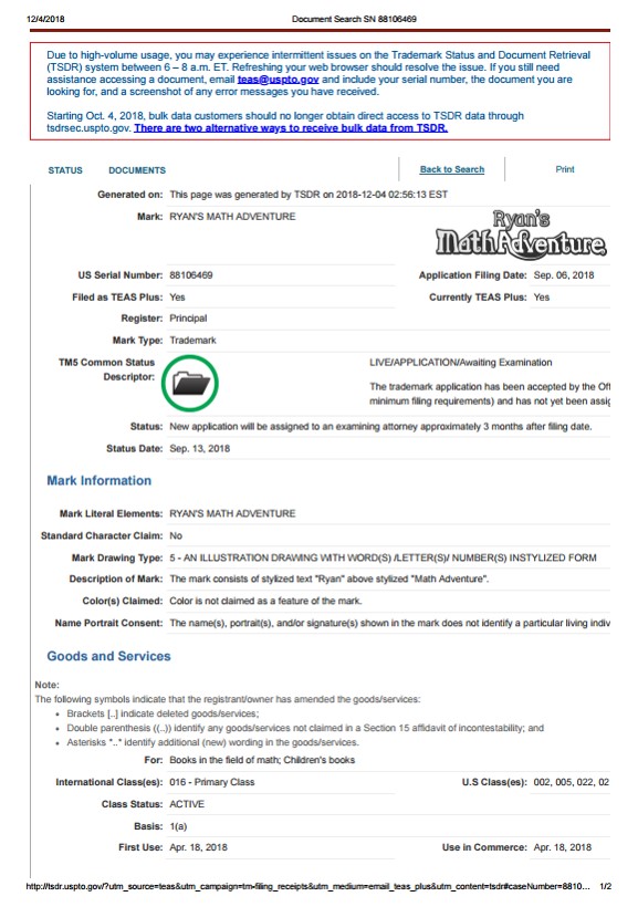 [USA/Trademark] RYAN'S MATH ADVENTURE