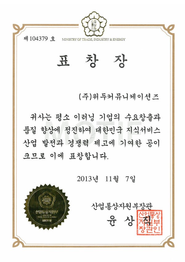 이러닝 기업의 수요 창출과 품질 향상 페이지 정보 작성자 WeDu 댓글 0건 조회 6,417회 작성일 19-05-30 19:32 본문 2013-11-07 표창장 제 104379호 이러닝 기업의 수요 창출과 품질 향상 산업통상자원부장관 윤상직 List Previous한국여성벤처협회 표창장 19.05.30 Next이러닝 콘텐츠 품질 인증 우수 심사 19.05.30