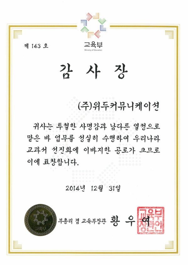 감사장 제 143호 페이지 정보 작성자 WeDu 댓글 0건 조회 6,547회 작성일 19-05-30 19:33 본문 2014-12-31 감사장 제 143호 교과서 선진화 부총리 겸 교육부장관 황우여 List Previous산업통상자원부 표창장 19.05.30 Next한국여성벤처협회 표창장 19.05.30