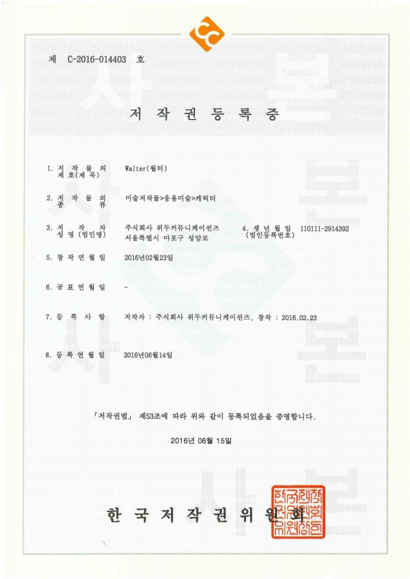[한국/저작권] 월터 페이지 정보 작성자 WeDu 댓글 0건 조회 6,568회 작성일 19-05-30 19:09 본문 2016-06-15 저작권 C-2016-014403 월터 / 미술저작물>응용미술>캐릭터 List Previous[한국/저작권] 파벨 19.05.30 Next[한국/저작권] 필립 19.05.30