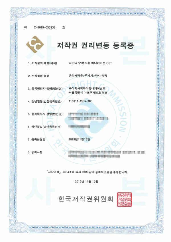 [한국/저작권] 리안의 수학 모험 애니메이션 OST 페이지 정보 작성자 WeDu 댓글 0건 조회 7,087회 작성일 19-11-25 13:54 본문 2019-11-18 저작권 C-2019-033938 음악저작물>주제가>작사·작곡 List Previous[한국/저작권] 리안의 수학 모험 여정의 시작 1,2,3,4,5 21.12.31 Next[한국/저작권] 애니메이션 리안의 수학 모험 19.11.25