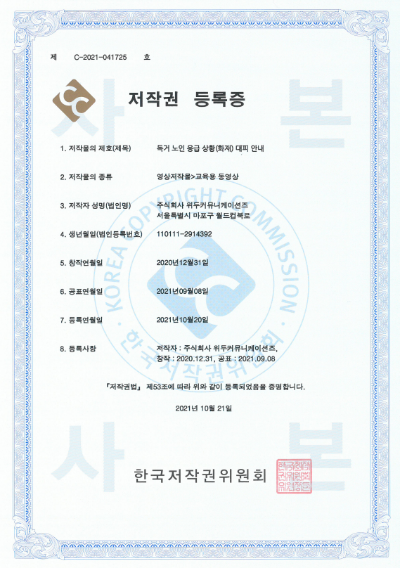 [한국/저작권] 독거 노인 응급 상황(화재) 대피 안내 페이지 정보 작성자 WeDu 댓글 0건 조회 7,023회 작성일 21-12-31 12:41 본문 2021-10-21 저작권 C-2021-041725 영상저작물>교육용 동영상 List Previous[한국/저작권] 장보기 인지훈련 게임 21.12.31 Next[한국/저작권] OLL KIDS/MATH 21.12.31