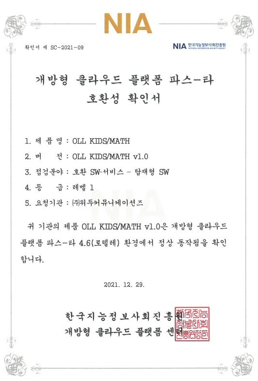 [한국/확인서] OLL KIDS/MATH 파스-타 호환성 확인서 페이지 정보 작성자 WeDu 댓글 0건 조회 11,115회 작성일 21-12-31 12:48 본문 2021-12-29 확인서 제 SC-2021-09 점검분야 : 호환 SW서비스 - 탑재형 SW List Next[한국/인증서] OLL KIDS/MATH 클라우드 서비스 확인서 21.12.31