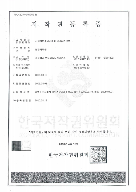 [한국/저작권] 신입사원조기전력화 이러닝 콘텐츠 페이지 정보 작성자 WeDu 댓글 0건 조회 6,622회 작성일 19-05-30 19:01 본문 2010-04-13 저작권 C-2010-004069 신입사원조기전력화 이러닝콘텐츠 / 편집저작물 List Previous[한국/저작권] 리안의 수학 모험 19.05.30 Next[한국/상표] OLL 41류 19.05.30